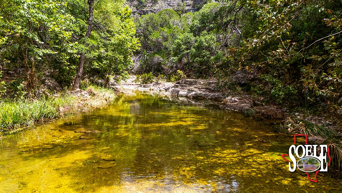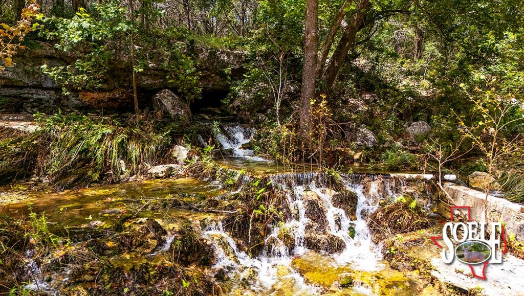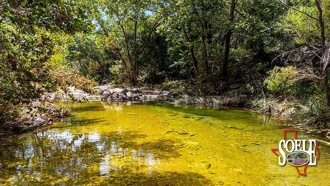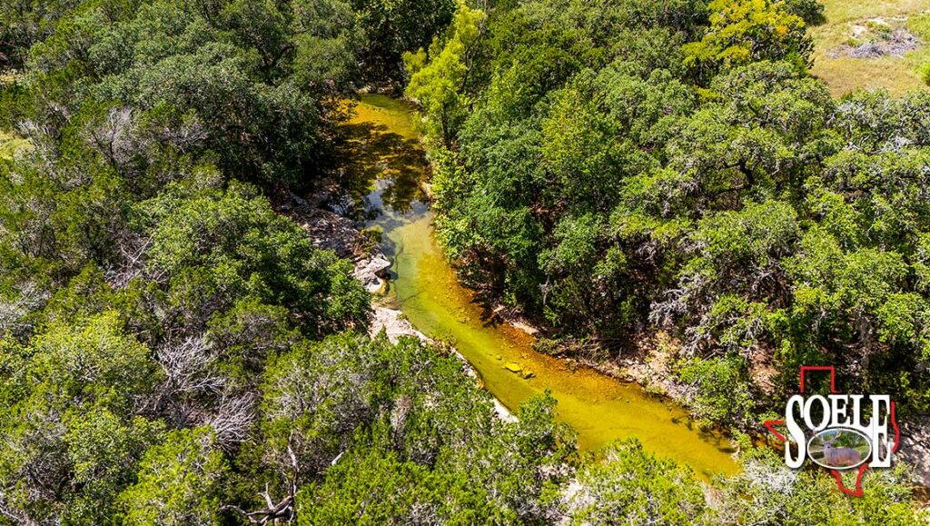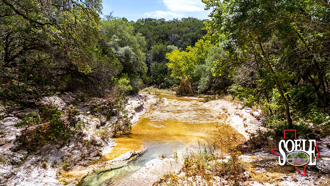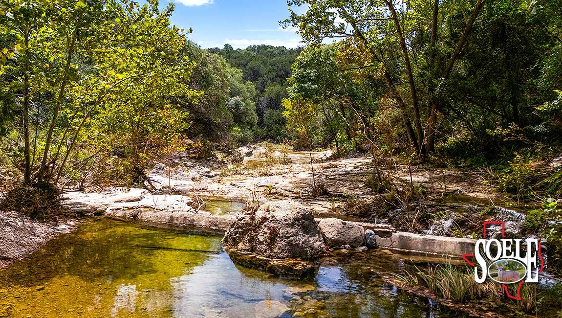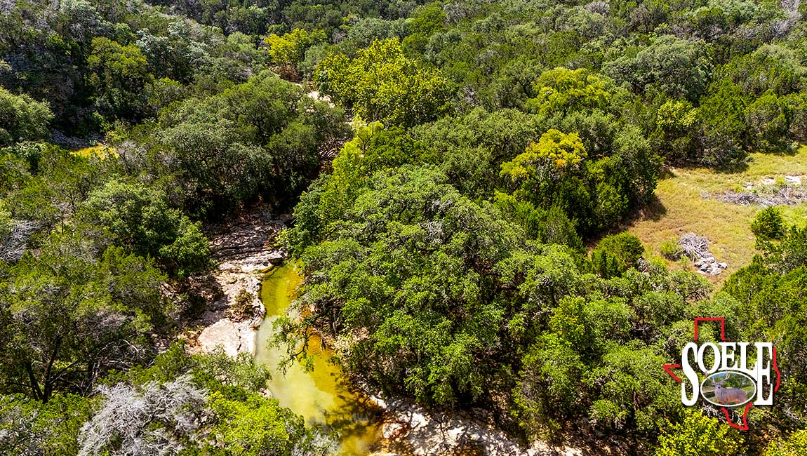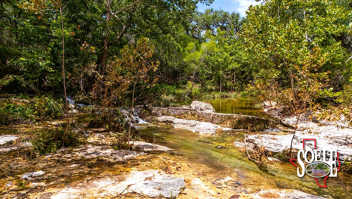Both sides of a solid rock bottom, crystal-clear, spring-fed creek with cascading waterfalls, limestone ledges and bluffs, deep holes and fed by one of the best gushing springs I have seen in a long time!!! Giant trees, nice valleys, rolling topography with panoramic views of the sought-after Texas Hill Country make this property one in a million!! I rarely ever see these go up for sale!